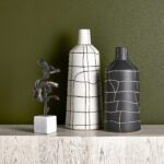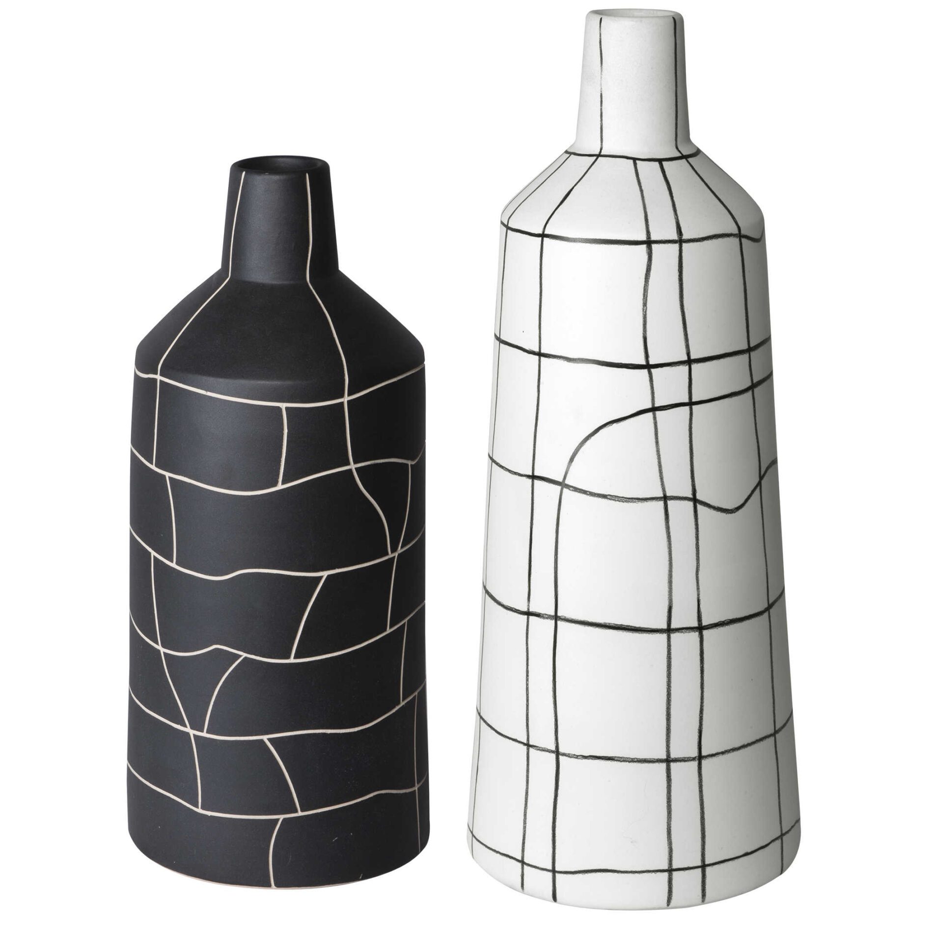 The ceramic Network Bottles are finished with a matte glaze decoration, and their black and white patterns are inspired by urban street maps. For decorative use only. May be used outdoors, but protection from freezing temperatures is recommended. Sizes: S-8x18x8, L-9x22x9