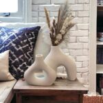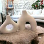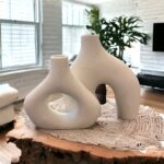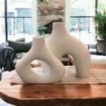 Very eclectic bohemian set of u-shaped and ring shaped Nordic vases make a beautiful home décor addition to any home. Nordic Ceramic Hollow U Shaped Vase plus ring shaped complement is a unique and eye-catching addition to your home decor collection. Made from high-quality ceramic, this vase boasts a sleek and minimalist design with its U shape and hollow center. The smooth and polished surface of the vase at Interiors & Art gives it a modern and sophisticated look that’s sure to impress your guests. Plus, its high-quality ceramic material ensures that it’s durable, long-lasting, and easy to maintain. Make a statement with the Nordic set of Ceramic Hollow U Shaped Vases, and bring a touch of elegance and charm to any room in your home.. Large u vase measurements are: 20cm x 18.5cm Small ring Vase: 13.5cmx 15.5cm Makes a earthy natural part that works great with any dried floral design. Just for dry flowers. Please do not use water. Materials Ceramic : Ceramic, which is natural material, has a perfect touch as it is organic. Feel this natural material at home. Each piece is carefully wrapped and secured for shipping. If you ever have an issue with damage upon delivery please contact us right away. We work hard to make sure it gets delivered in perfect condition and want to make sure you are happy with your purchase. Large u vase measurements are: 20cm x 18.5cm Small ring Vase: 13.5cmx 15.5cm Circular bottleneck design Smooth lines Bottom grinding for smooth bottom surface Smooth finish with bold waves, each piece is hand finished to give a soft clean exterior. True color is a light beige with a hint of natural speckled variations of color. The reasons why water should not be used with this vase, the absence of a waterproof glaze that can cause potential damage to the ceramic surface. There is a small amount of glaze on the interior of the vase, that can allow you to only use water on an occasion. Since water is a key material in creating ceramics, water can a also cause the vase to weaken. Using this vase with dry flowers, such as its ability to showcase the natural beauty and delicate details of dried floral arrangements.Perfect vase for your favorite pampas grass, dried floral bouquet, faux silk florals or a perfect vase to display your dried wedding bouquet. Each piece is handcrafted in California by skilled artisans. The natural exterior and slightly glazed interiors make this vase stand out, the smooth finish on the interior helps the dried flowers not to stick when you are placing them in or out. The overall dimensions of the vase, including its height and width, is Large u vase measurements are: 20cm x 18.5cm Small ring Vase: 13.5cmx 15.5cm with some variation in the curves. This is a lite but mighty vase. The circular bottleneck design has a unique and practical feature that allows for easy arrangement and display of flowers. The smooth lines and bottom grinding add to the overall aesthetic appeal and functionality of the vase so the smooth edges allow you to move it on a wooden surface without any damage. Here are some frequently asked questions Can I use this vase for fresh flowers or water? Only small amounts and not often or it can change the color and or weaken the vase How do I clean this vase? Dry cloth is recommended. I have use air blowers to remove items inside the vase Is the ceramic material food-safe? Only dry food as it is not designed for that type of use. Can I place this vase in direct sunlight? It’s not recommended Does the vase come with any instructions for use? No, however I am always available if you have any questions Can I use this vase for other purposes besides holding dry flowers? It’s always gorgeous on its own and can be used as a complement to other natural dried vases. What is the weight of the vase? Weight is approximately 1.5 pounds each as it is a lightweight ceramic. Is the exterior of the vase rough or smooth? All of our vases are made to be smooth unless it just has a texture to me more uneven however all are made to have an even smooth to the touch finish. Can I use this vase outdoors? The natural ceramic can be a beautiful complement to your garden. Outside patio. It just needs to stay covered as the sun can deteriorate the exterior of the vase. Is the bottleneck design easy to pour dry flowers into? The bottleneck design is a definite added feature that helps you easily take flowers in and out in a way not to damage the flowers. We hope you love our products!23 in stock