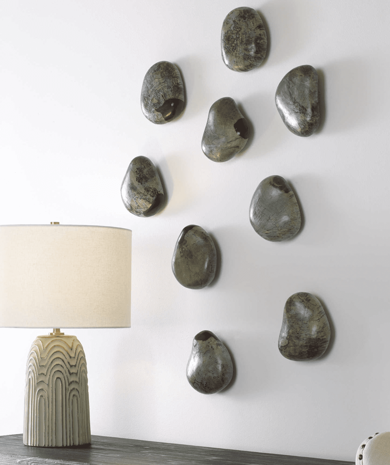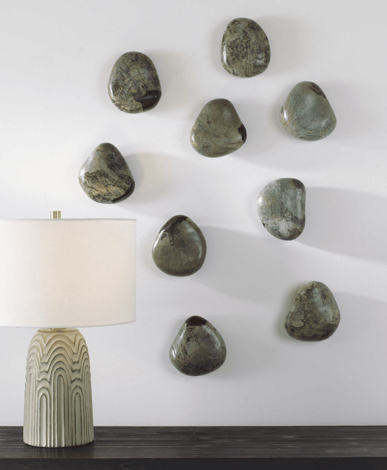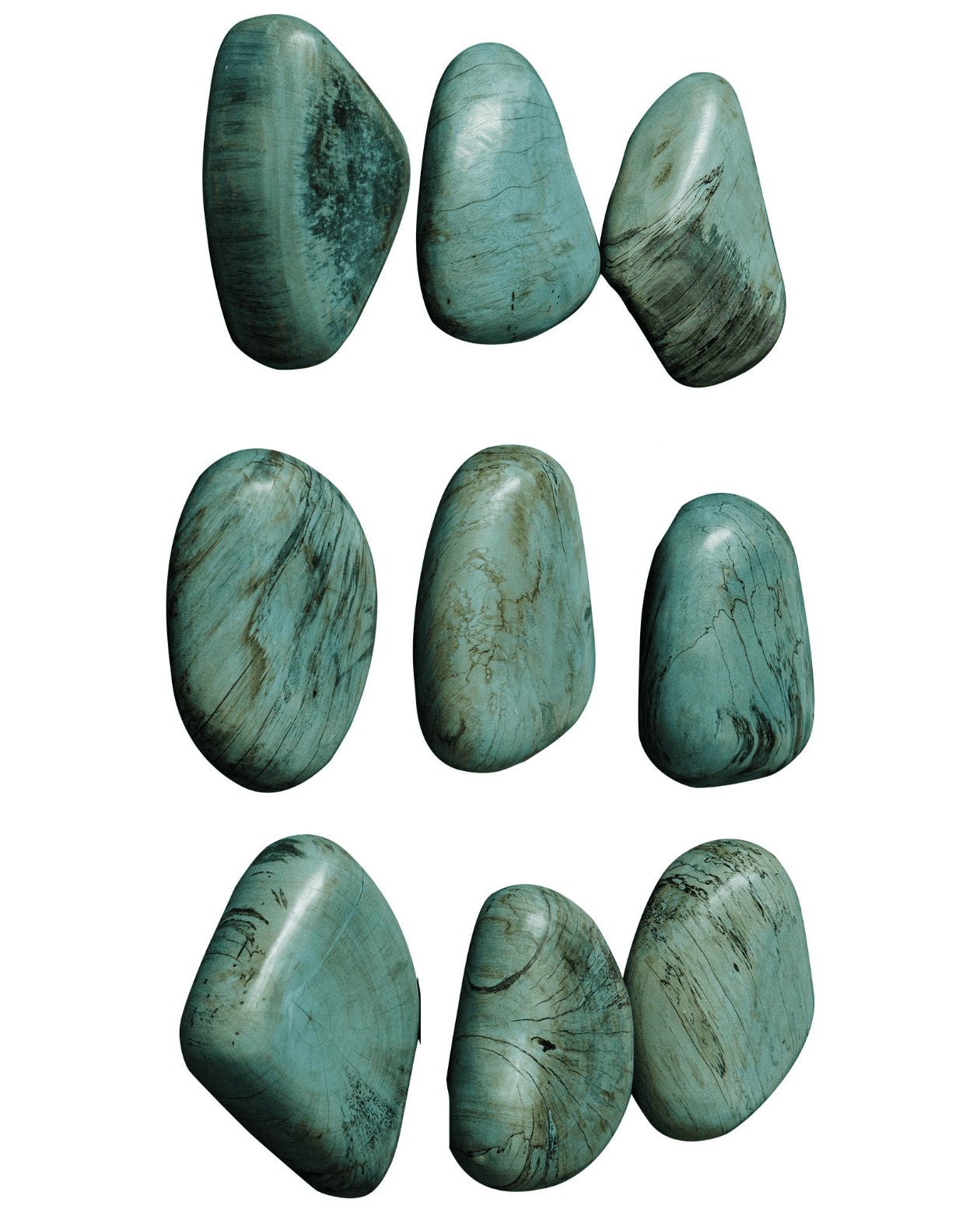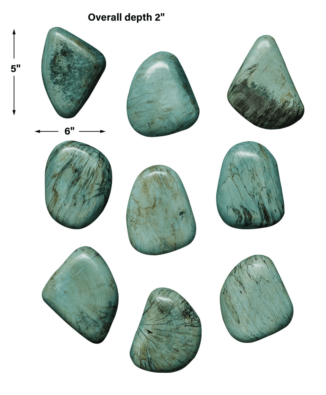 Bringing the elements of nature indoors, these fun wall pebbles feature solid tamarind wood with natural spalting details in an aqua stain. Solid wood will continue to move with temperature and humidity changes, which can result in small cracks and uneven surfaces, adding to its authenticity and character. Sizes and grain pattern may vary due to the authentic nature.