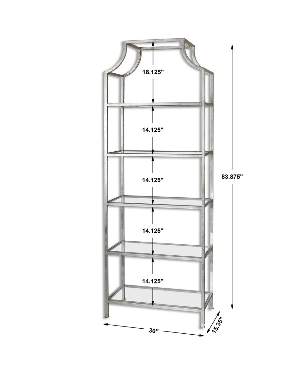 - Materials: iron etagere features a bright silver leaf finish with five tempered glass shelves.