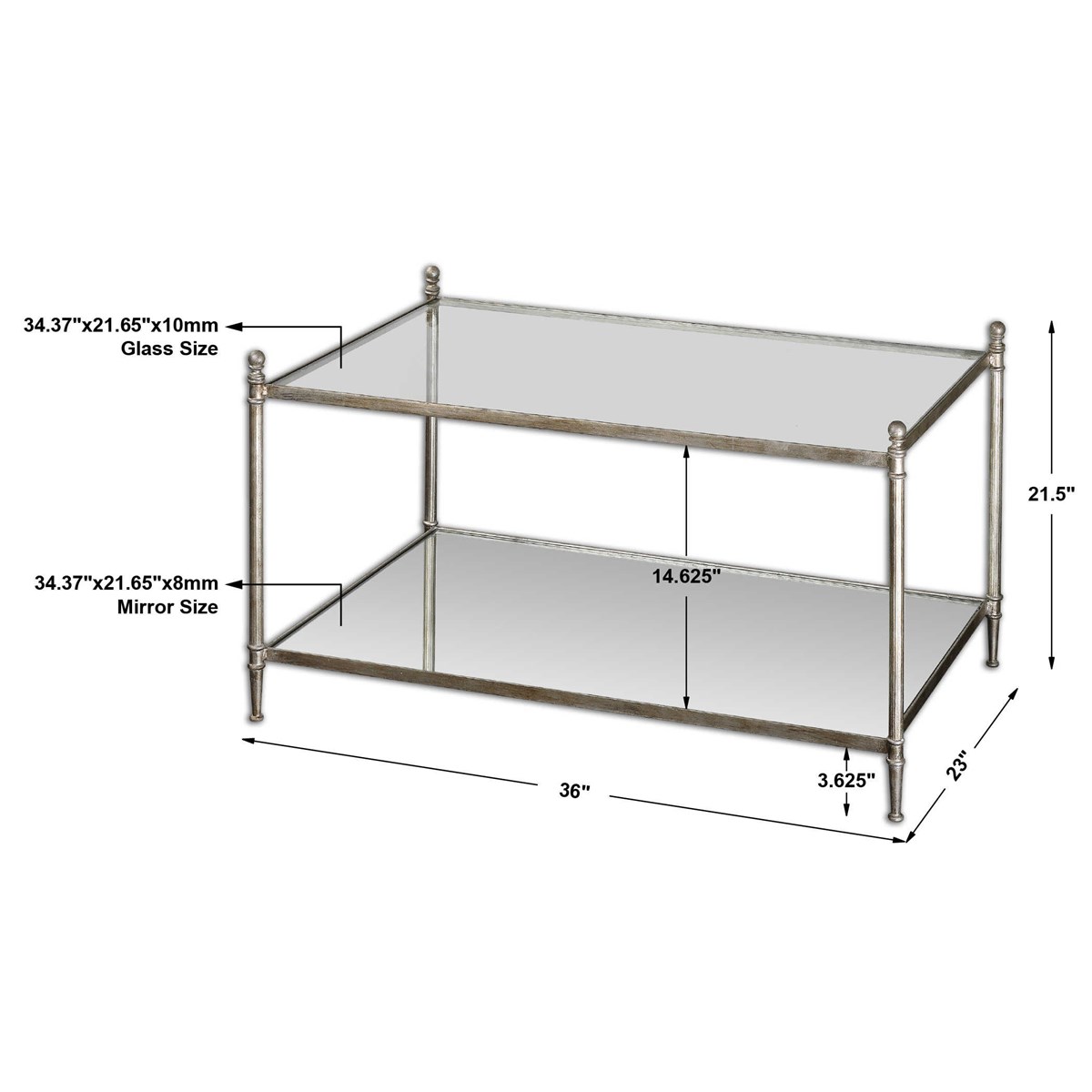 - Materials: Forged iron frame in antiqued silver leaf with a mirrored top and clear, tempered glass gallery shelf.
