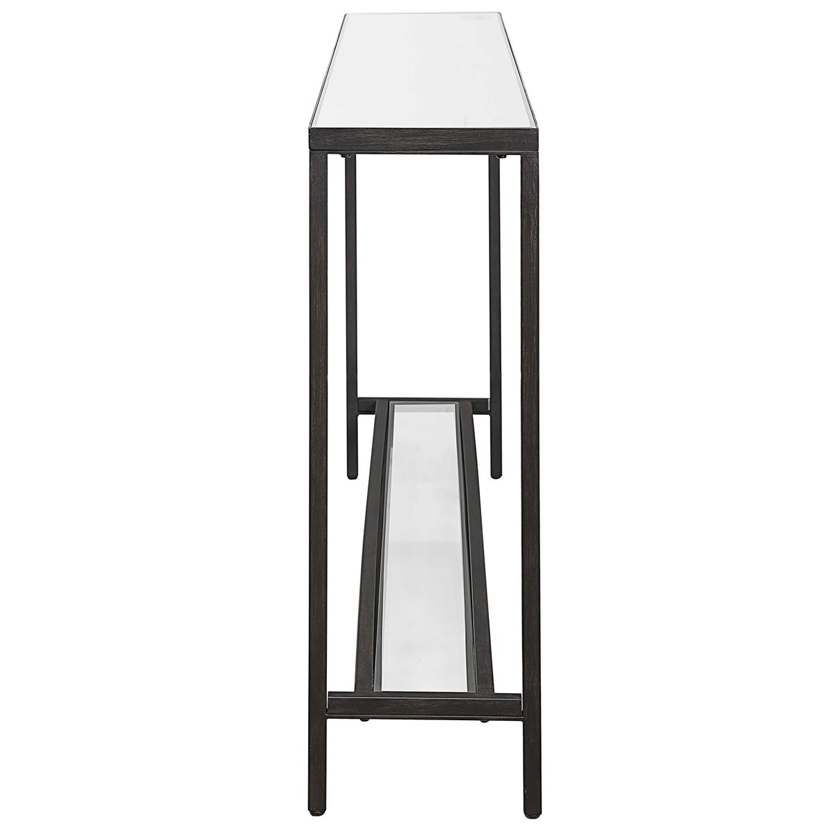 - Materials: table in steel is finished with a streamlined rustic black, inset with a beveled mirrored top, and gallery shelf in clear glass.