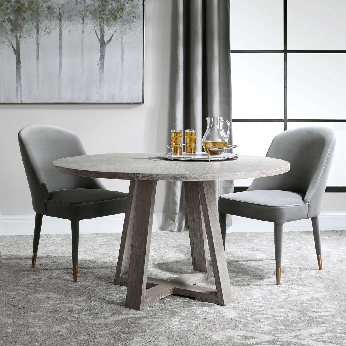 - Materials: a richly grained oak veneer inlaid top finished in a soft gray with hints of brown undertones, atop a sturdy elm wood trestle base