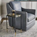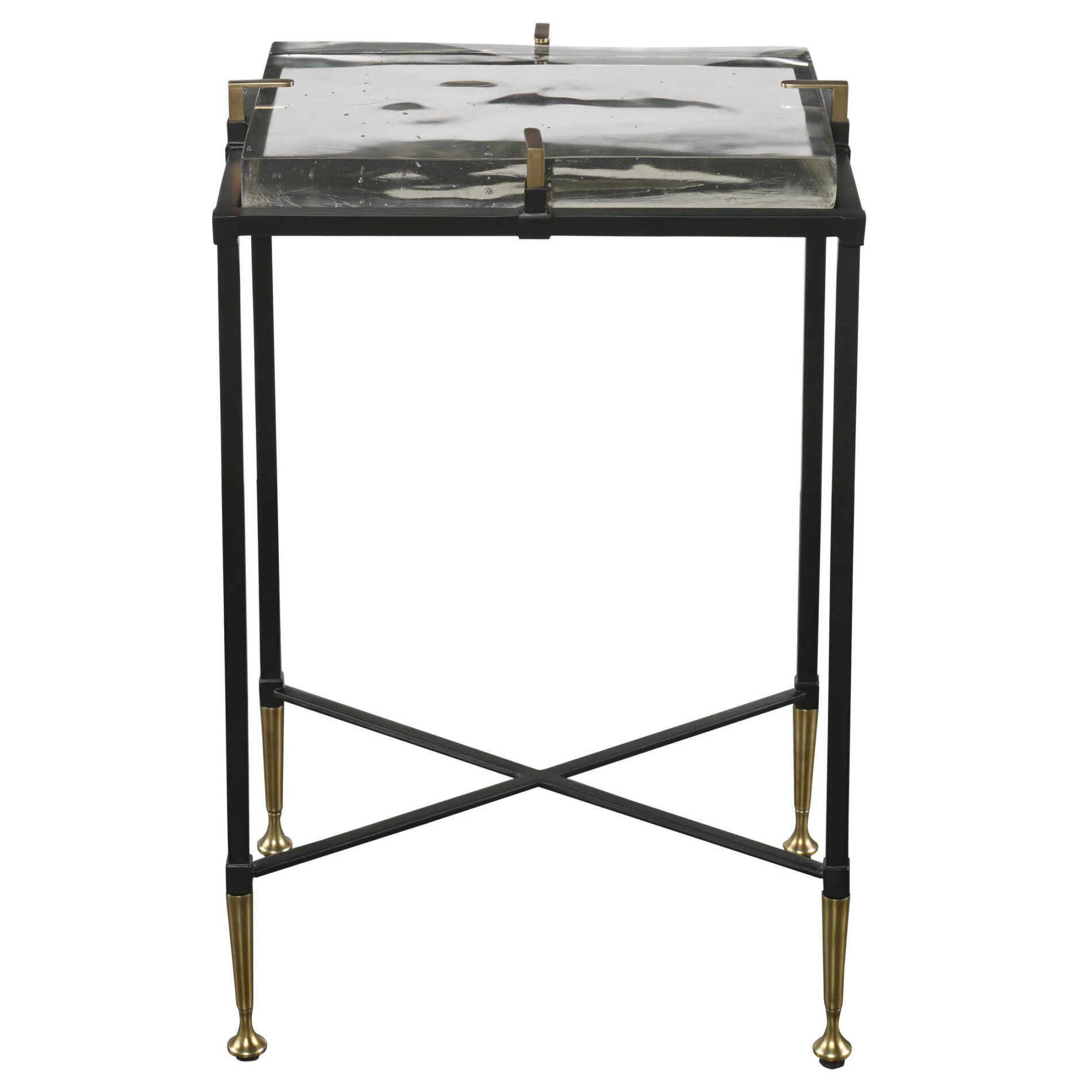 The Ice Block Table has an impressive 1 1/2″ thick seeded glass top held in place with four solid brass clips. Made of solid iron with a black finish, featuring beautiful solid brass feet, all lending itself to a found antique treasure. It is the perfect chair side table that will blend well into any style room. With the use of recycled glass, each piece will be unique and may have slight imperfections.