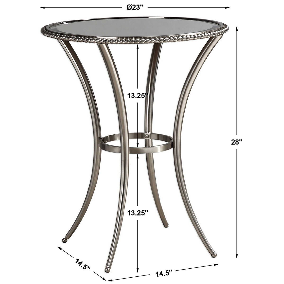 - Materials: beveled mirror top make a classic accent, along with tapering arched legs and ball feet in a plated brushed nickel finish.