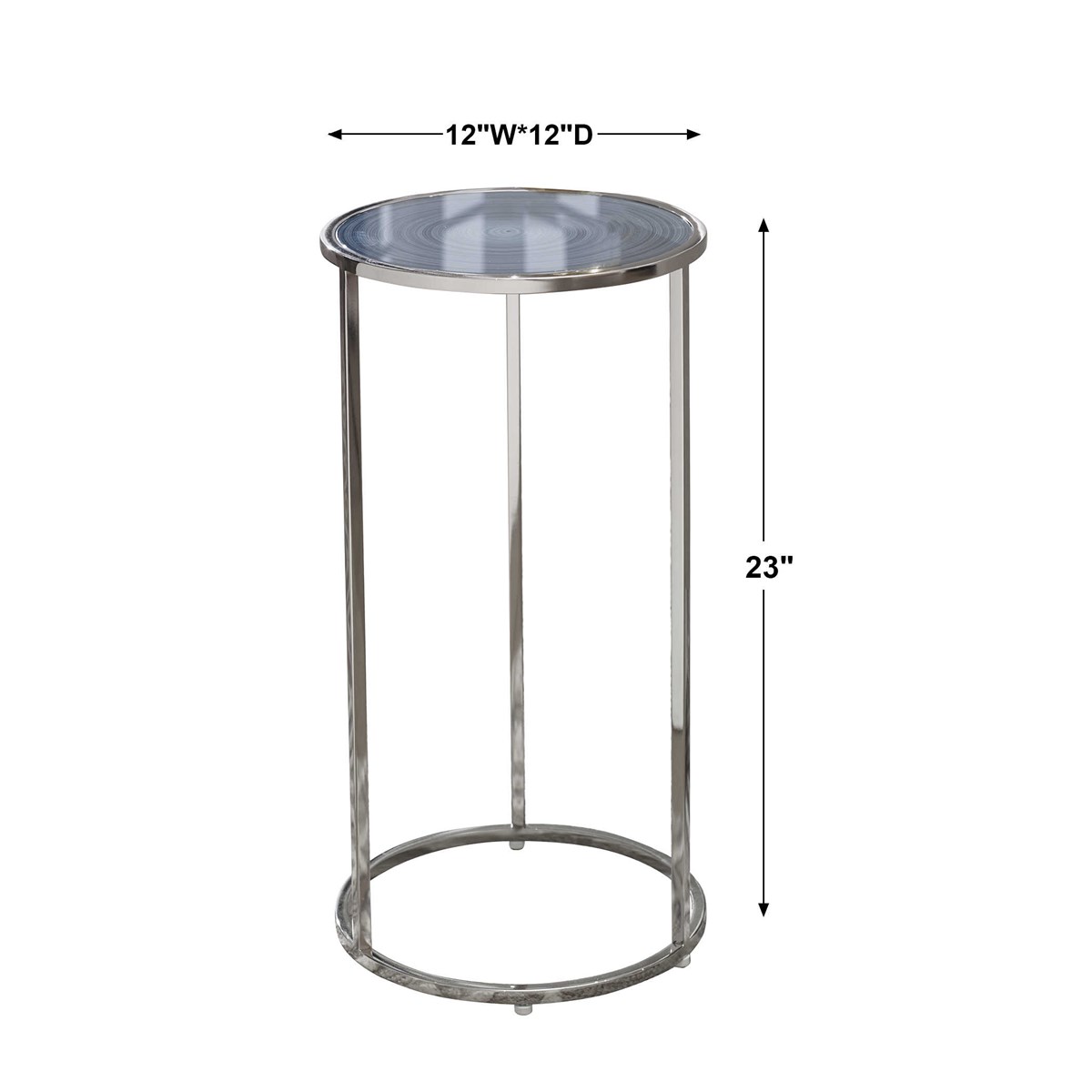 - Materials: tempered glass top in a unique charcoal, light gray and white swirl design, accented by a sleek polished nickel plated stainless steel base.