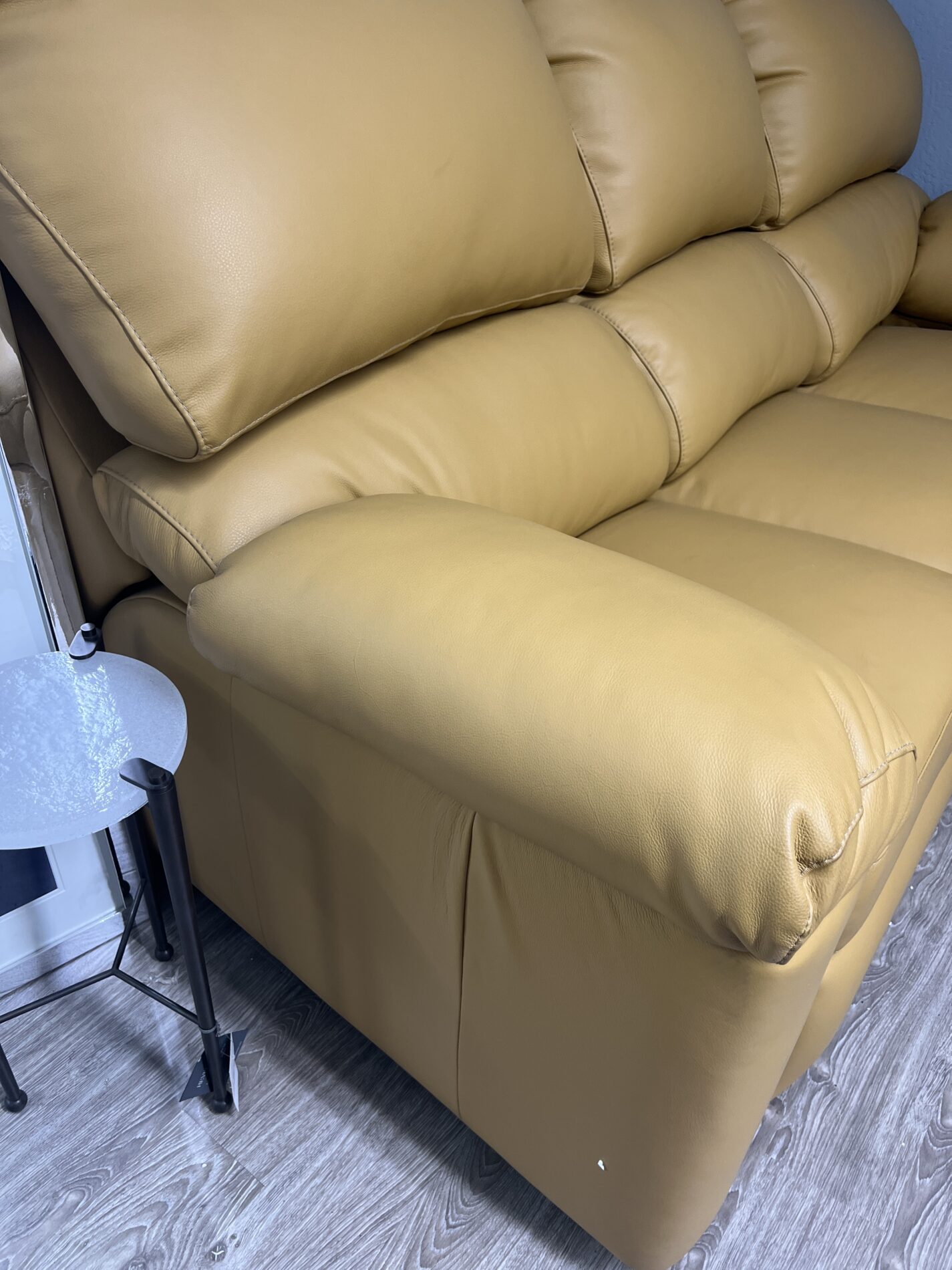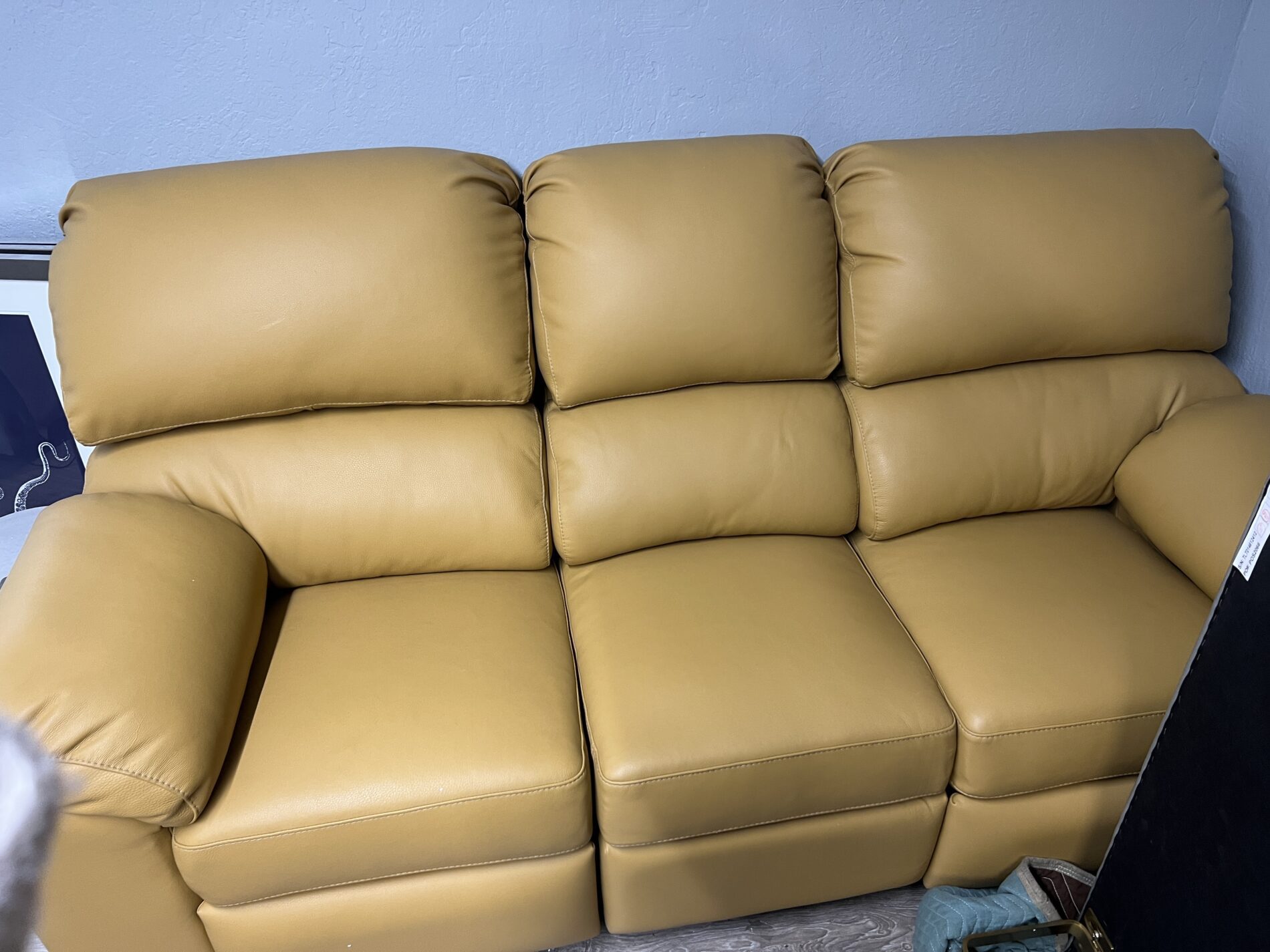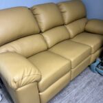This hand made double lumbar padded arm sofa gives you ample support while allowing you to suburge into the surrounding comfort of the piece. Manual push back dula recliners on each end for maximum comfort.   Sofa 88x 36×39