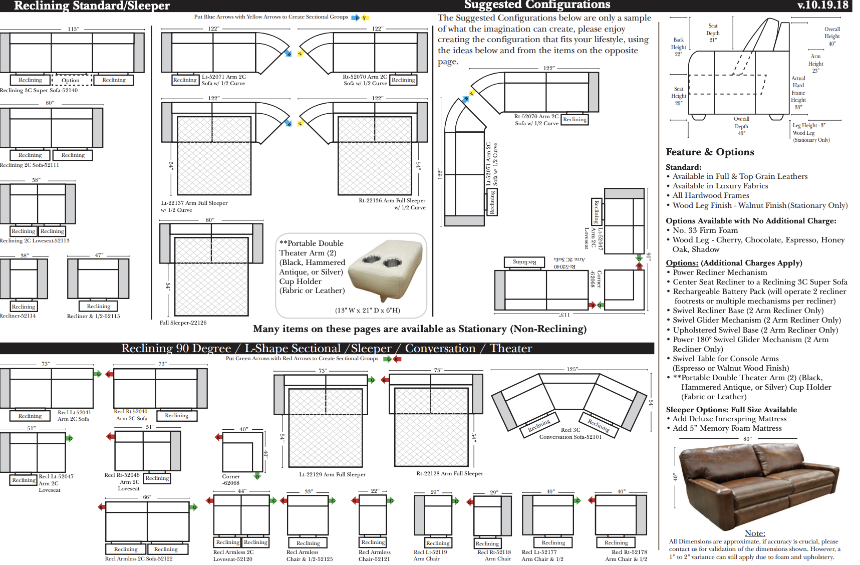 - Leather or Fabric Covers: 100% Top Grain Leather no bonded leathers, split hides or vinyl ever. Over 200 Leathers of 30 types, including designer patterns. Over 100 luxury fabrics options, including performance fabrics two-tone leather options and fabric/leather combinations.