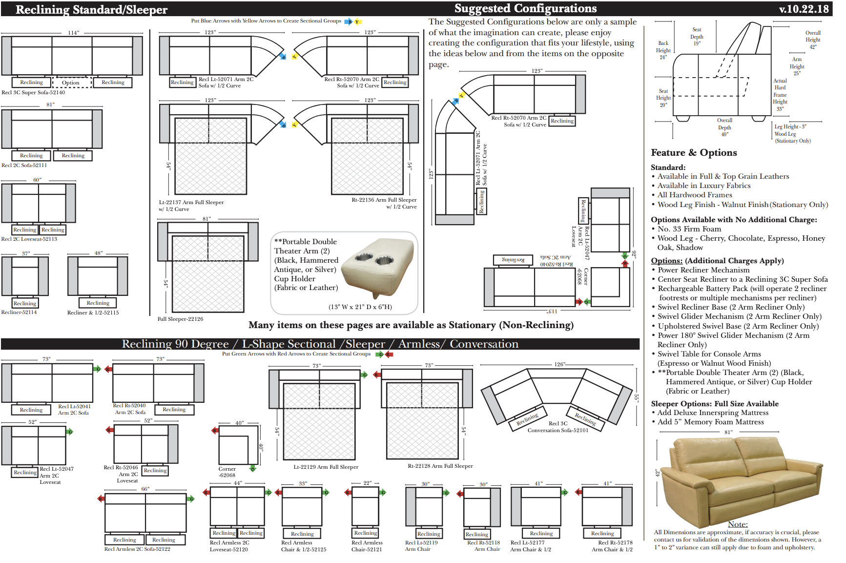 - Leather or Fabric Covers: 100% Top Grain Leather no bonded leathers, split hides or vinyl ever. Over 200 Leathers of 30 types, including designer patterns. Over 100 luxury fabrics options, including performance fabrics two-tone leather options and fabric/leather combinations.