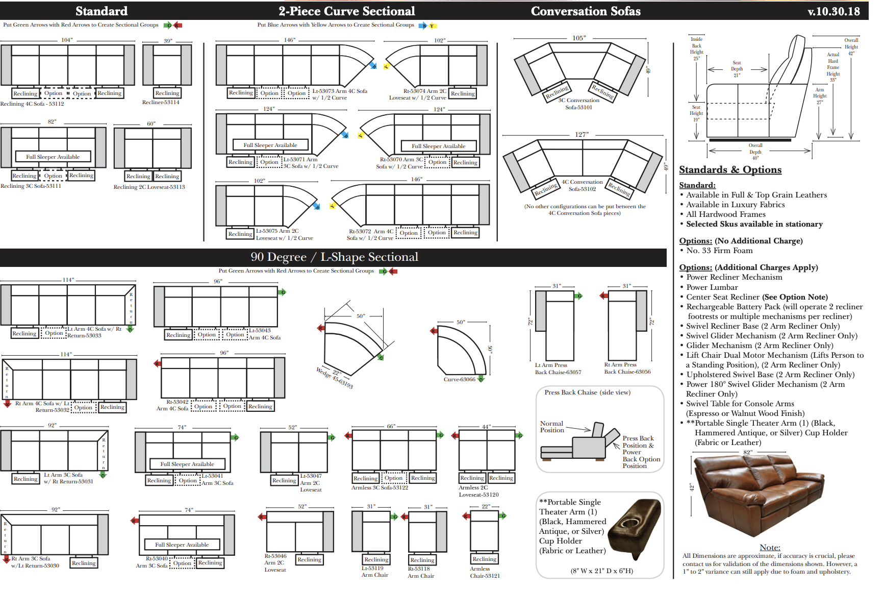 The power is yours in any style, size or shape when you design your own style. Arm, Back, Chaise and Leg Style Options Power Reclining and Tilt Headrests are Standard.* Standard skematics for each style shown in photo gallery. Here are a few of the fabric lines we offer on top of our world class selction of leathers. KravetKravetKravetKravetKravet Maxwell Fabrics Robert Allen Home Sunbrella logo