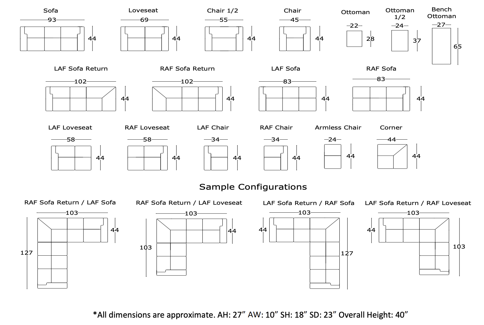 Any of our models can be customized from our selection of fabric or leather samples or custom finishes. Each Style can also be made in a variety of sizes and sectional configurations. Fabrics availible: