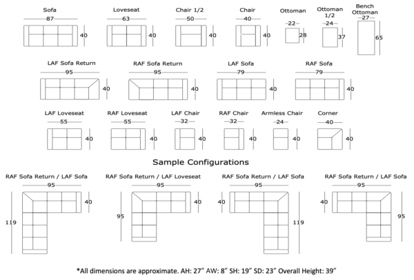 Any of our models can be customized from our selection of fabric or leather samples or custom finishes. Each Style can also be made in a variety of sizes and sectional configurations. Fabrics availible: