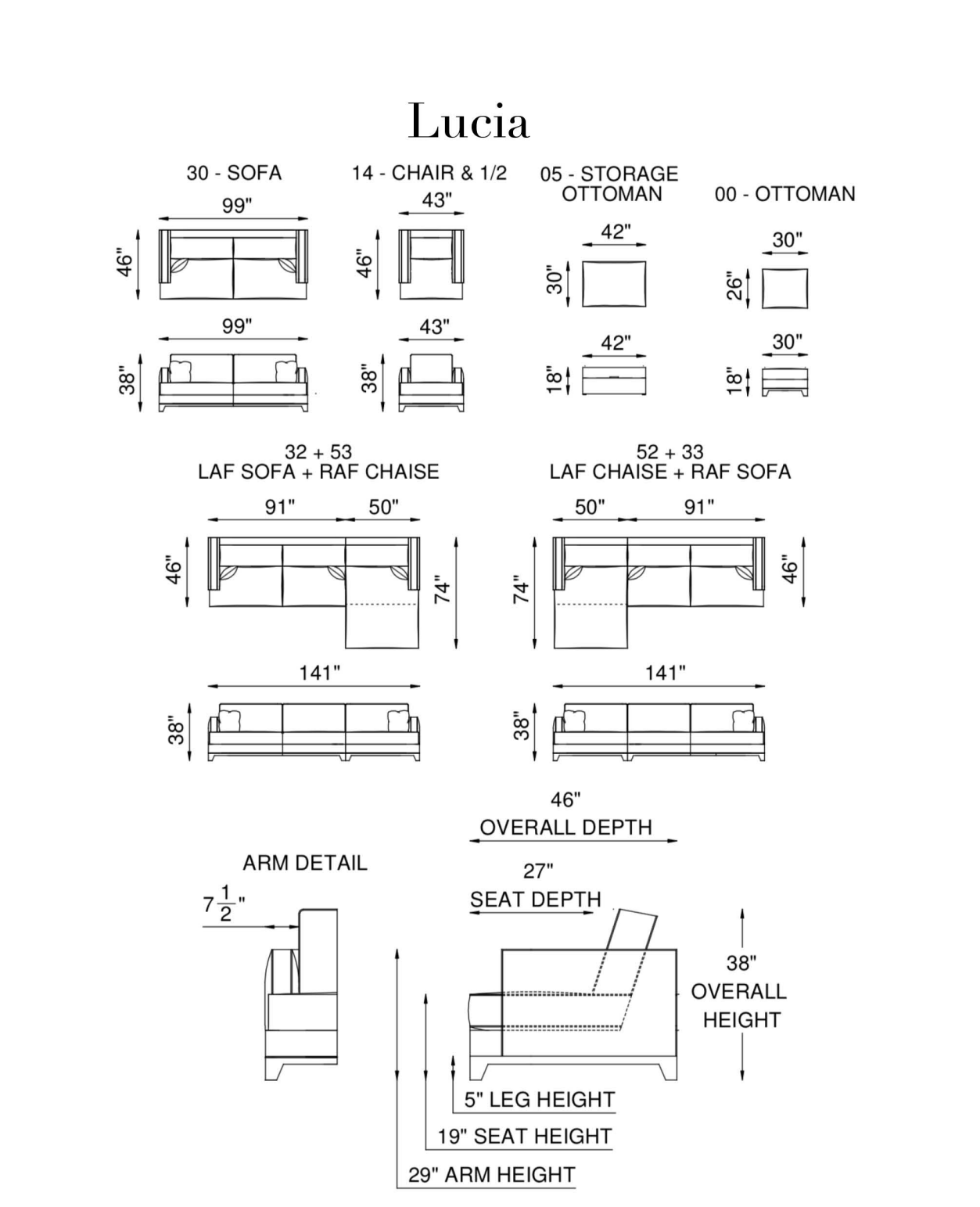 Lucia Right Arm Sofa, Left Arm Chaise