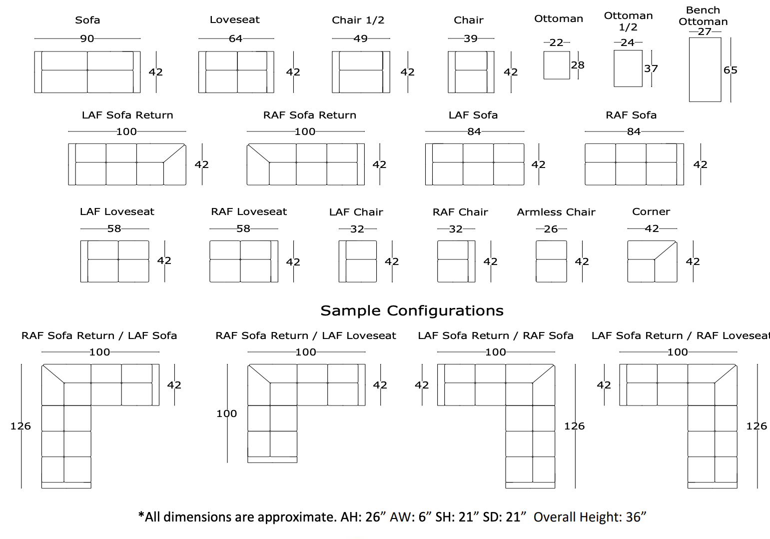 Any of our models can be customized from our selection of fabric or leather samples or custom finishes. Each Style can also be made in a variety of sizes and sectional configurations. Fabrics availible: